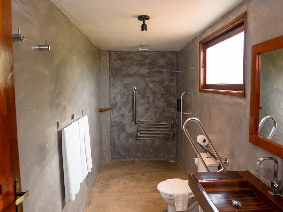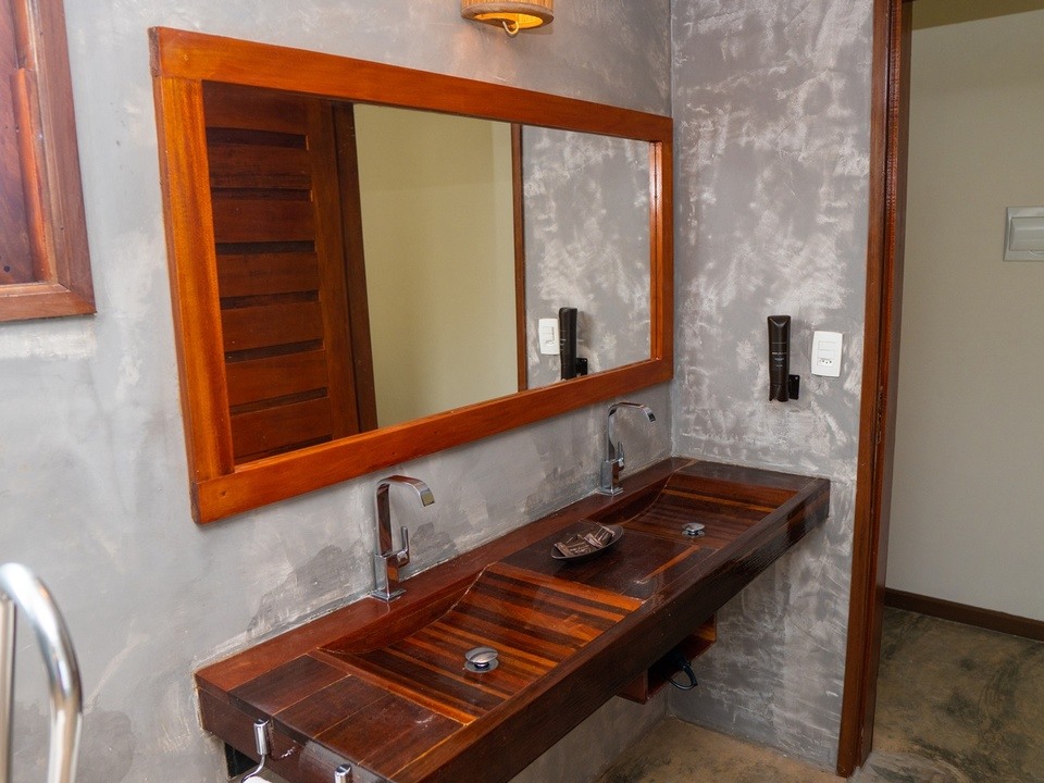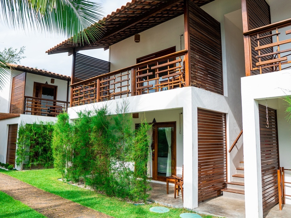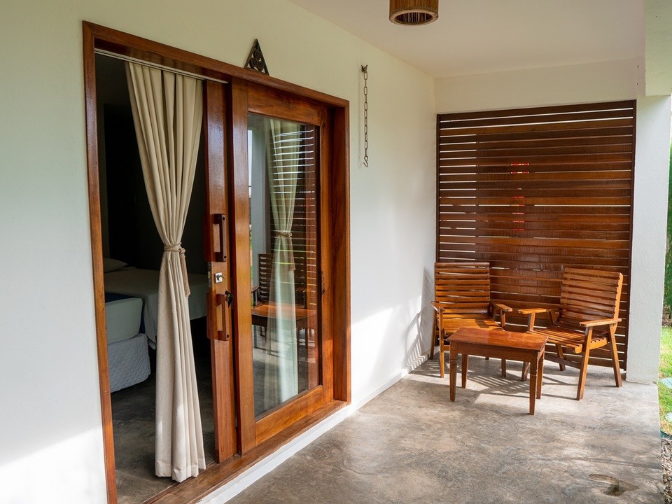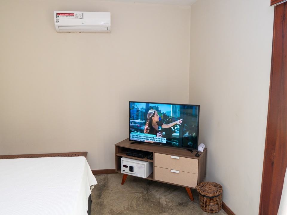 Quarto com cama King size e vista para o jardim, ar condicionado, frigobar, máquina de café expresso, TV a cabo, cofre e secador de cabelo.